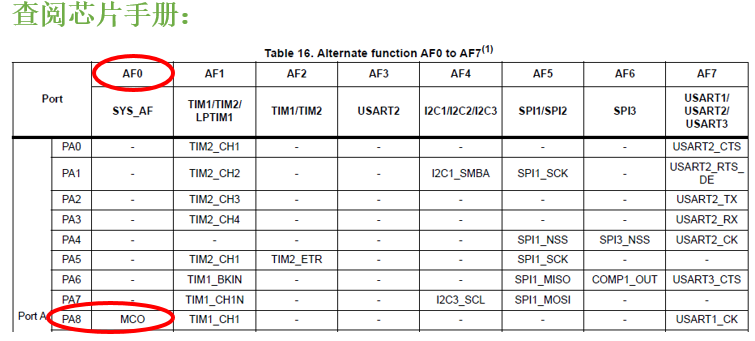 PA8用于时钟输出,是利用PA8的IO复用功能,查阅芯片手册,找到PA8的复用功能列表如下: