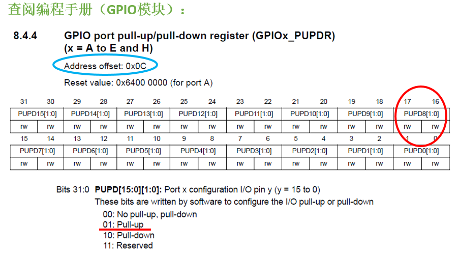 将PA8设置为上拉,查阅编程手册找到寄存器GPIOx_PUPDR: