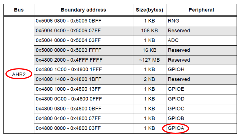 手册,里面列表了各个片内设备的地址区间,找到包含GPIOA的那一部分,如图所示: