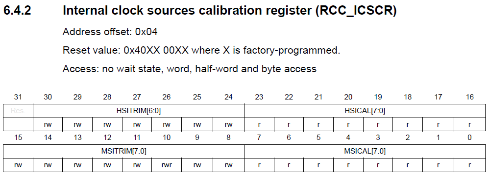 复位后,出厂校准值加载到内部时钟源校准寄存器(RCC_ICSCR)的HSICAL[7:0]位中。