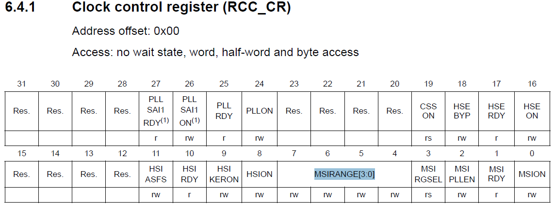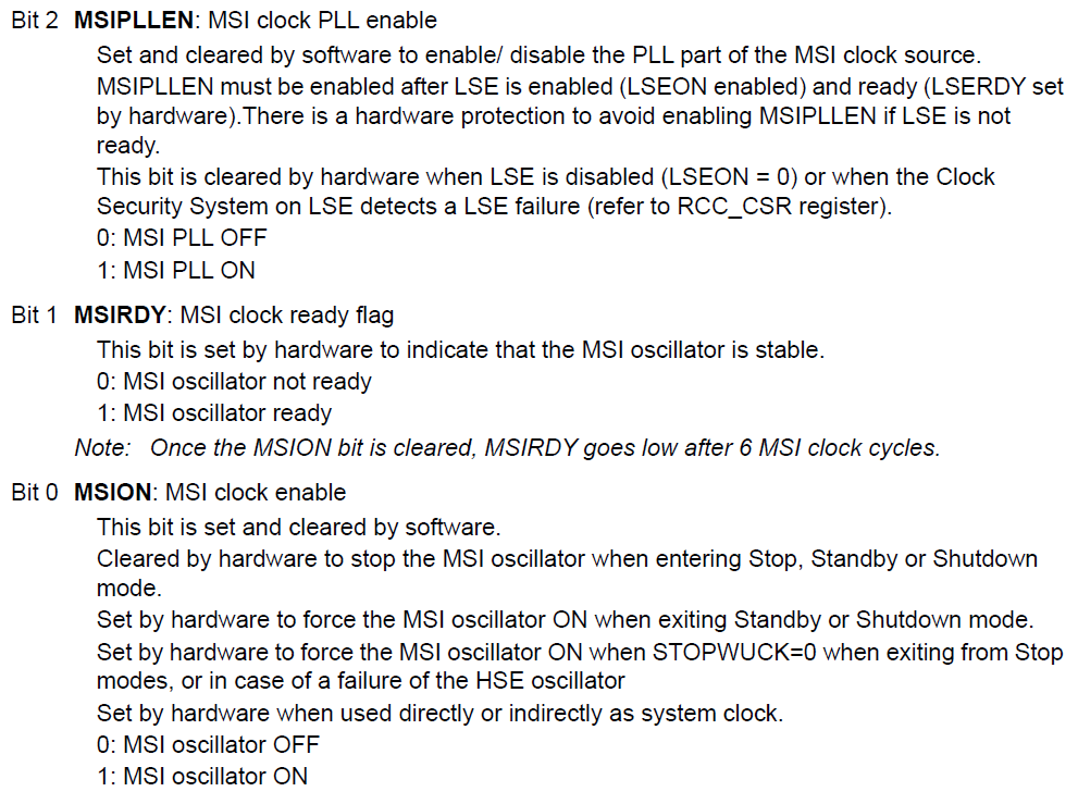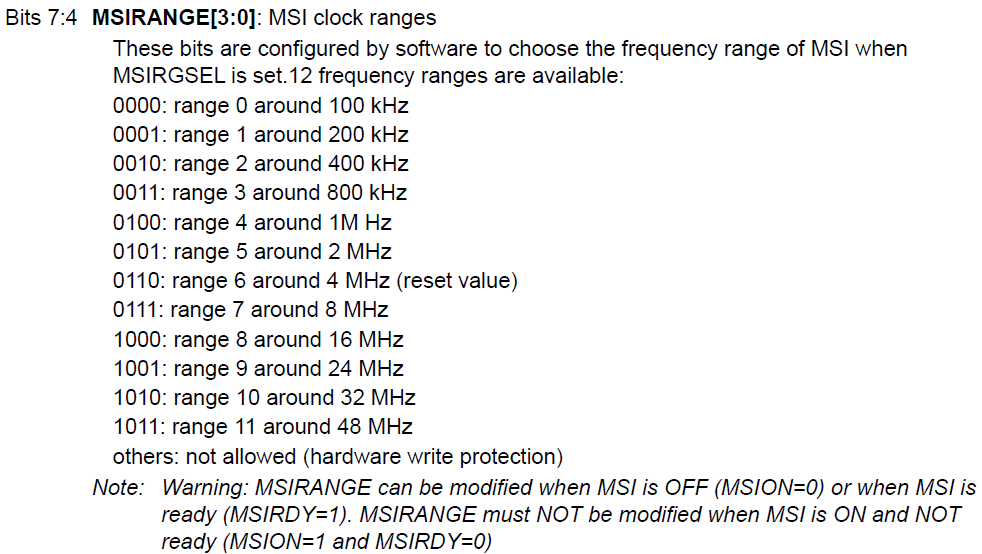MSI时钟信号由内部RC振荡器产生。其频率范围可以通过软件使用时钟控制寄存器(RCC_CR)中的(MSIRANGE[3:0])位(图1)进行调整。有12个频率范围可供选择:100kHz、200kHz、400kHz、800kHz、1 MHz、2MHz、4MHz(默认值)、8MHz、16MHz、24MHz、32MHz、48MHz。