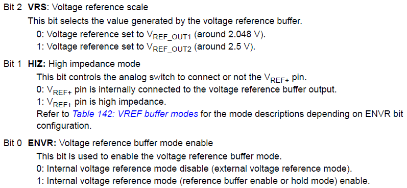 通过VREFBUF控制和状态寄存器(VREFBUF_CSR)中设置(ENVR=1)位来启用内部电压基准。当(VRS=1)时,电压参考被设置为2.5V,当(VRS=0)时,电压基准被设置为2.048V。当(H