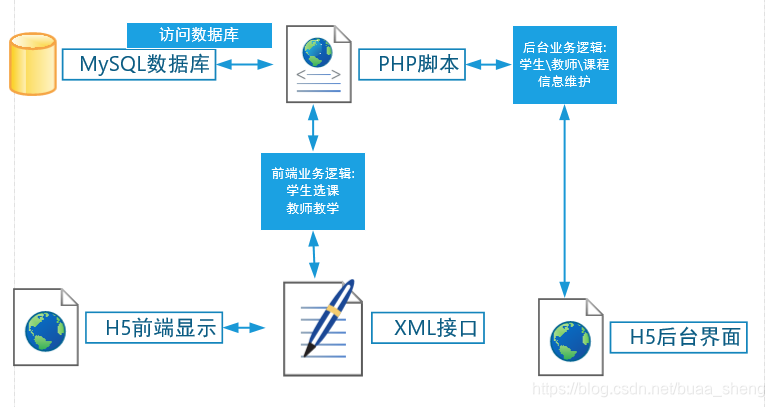 其中,如上图所示,PHP所负责部分主要有4处,访问数据库、前端业务逻辑、后台业务逻辑、接口返回,下面分4小节进行描述。