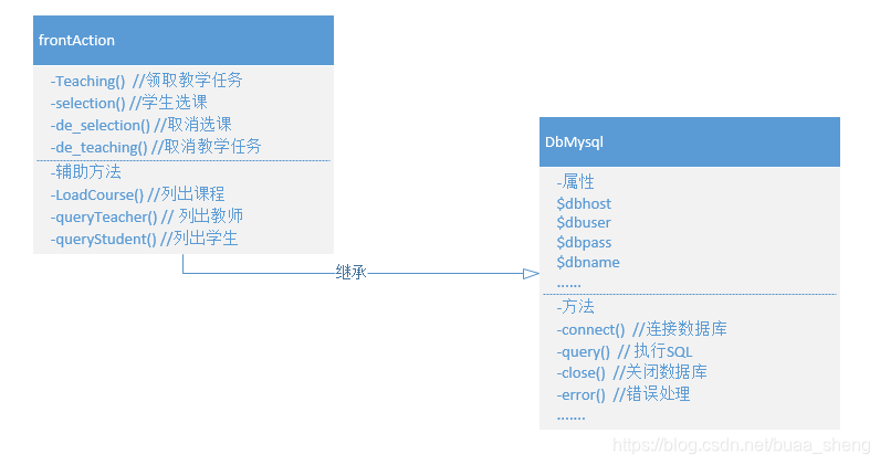 本节最后,我们需要说明的是,为了重复使用上一小节的数据库操作类DbMysql,我们使用了一个面向对象编程时经常用的“继承”定义,即,我们定义的新类(命名为:frontAction)集成于DbMysql,也就是说,frontAction类完全具有DbMysql的所有开放功能,同时还有我们新实现的该类所独有的功能。示意图如下