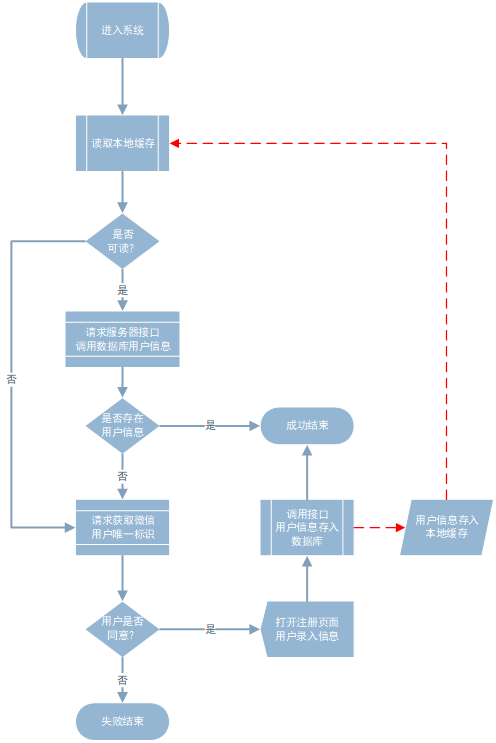 总体流程为:程序启动时,查找本地是否存在用户信息缓存,通过缓存获得用户唯一标识,调用接口查询数据库中是否有相应的用户信息,如果有,则将信息读取过来,利用前端进行显示。