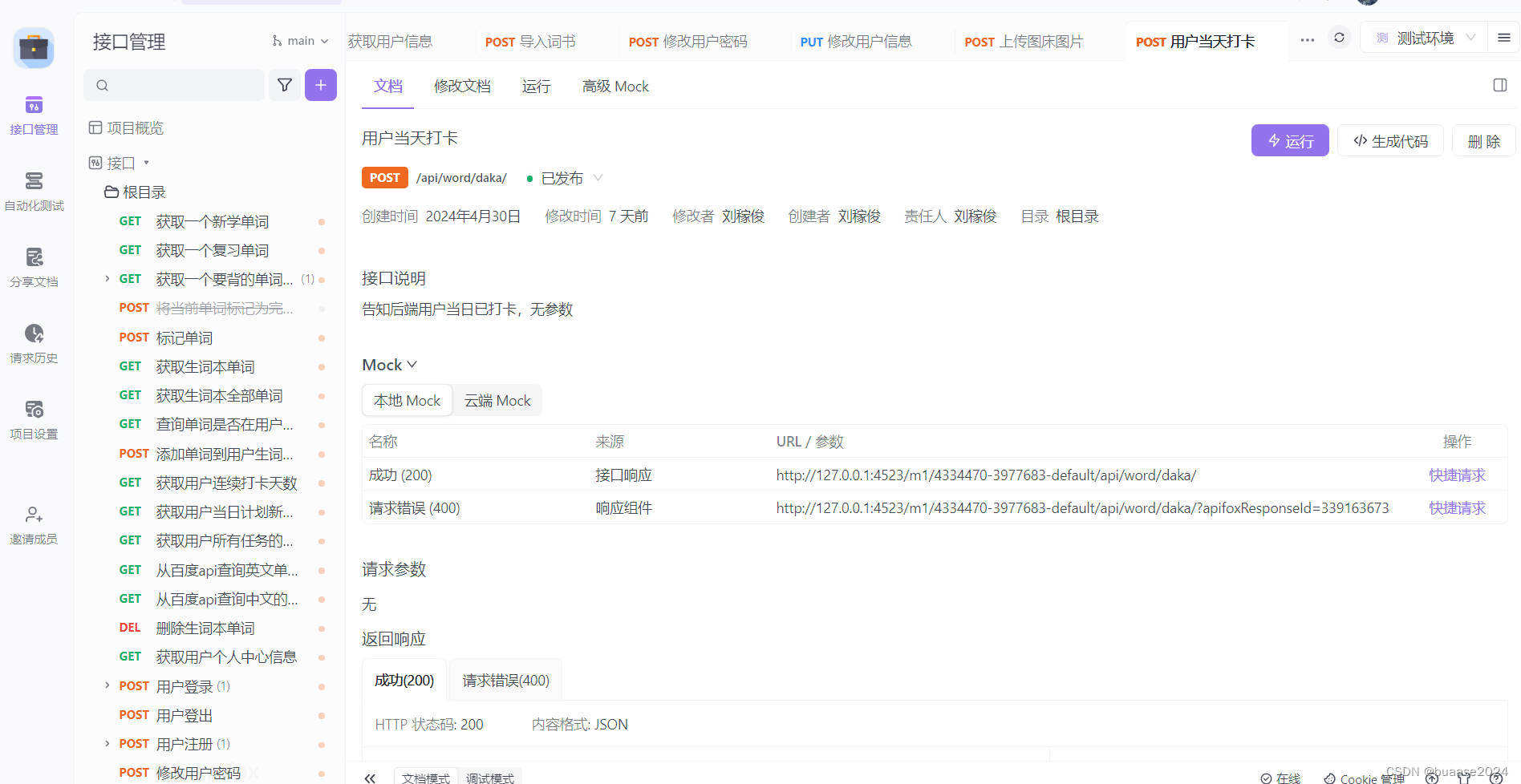 项目文档:采用apifox记录接口文档;腾讯共享文档记录会议纪要。