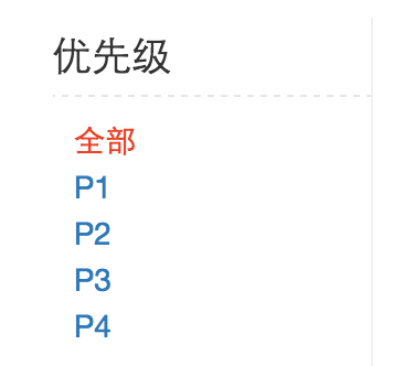 <div class="sidebar"> <ul> <li>优先级 <ul> <li><aonclick=""class="sidebar-selected">全部</a></li> <li><aonclick="">P1</a></li> <li><aonclick="">P2</a></li> <li><aonclick=“" >P3</a></li> <li><aonclick="">P4</a></li> </ul> </li> </ul> </div>
