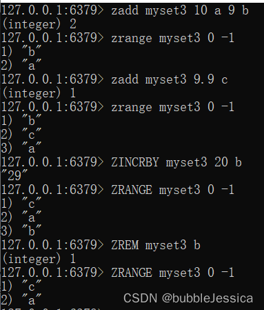 * ZADD key score1 member1 [score2 member2] 向集合中添加元素 * ZRANGE key start stop [WITHSCORES] 获取集合所有元素(升序) * ZINCRBY key increment member 向集合中指定元素增加分数比 * ZREM key member [member2] 移除集合中的元素