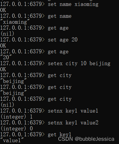 * SET key value 设置指定key的值 * GET key 获取指定key的值 * SETEX key seconds value 设置指定key的值,有效时间为seconds秒 * SETNX key value 只有key不存在才可以设置key的值成功返回1,失败返回0
