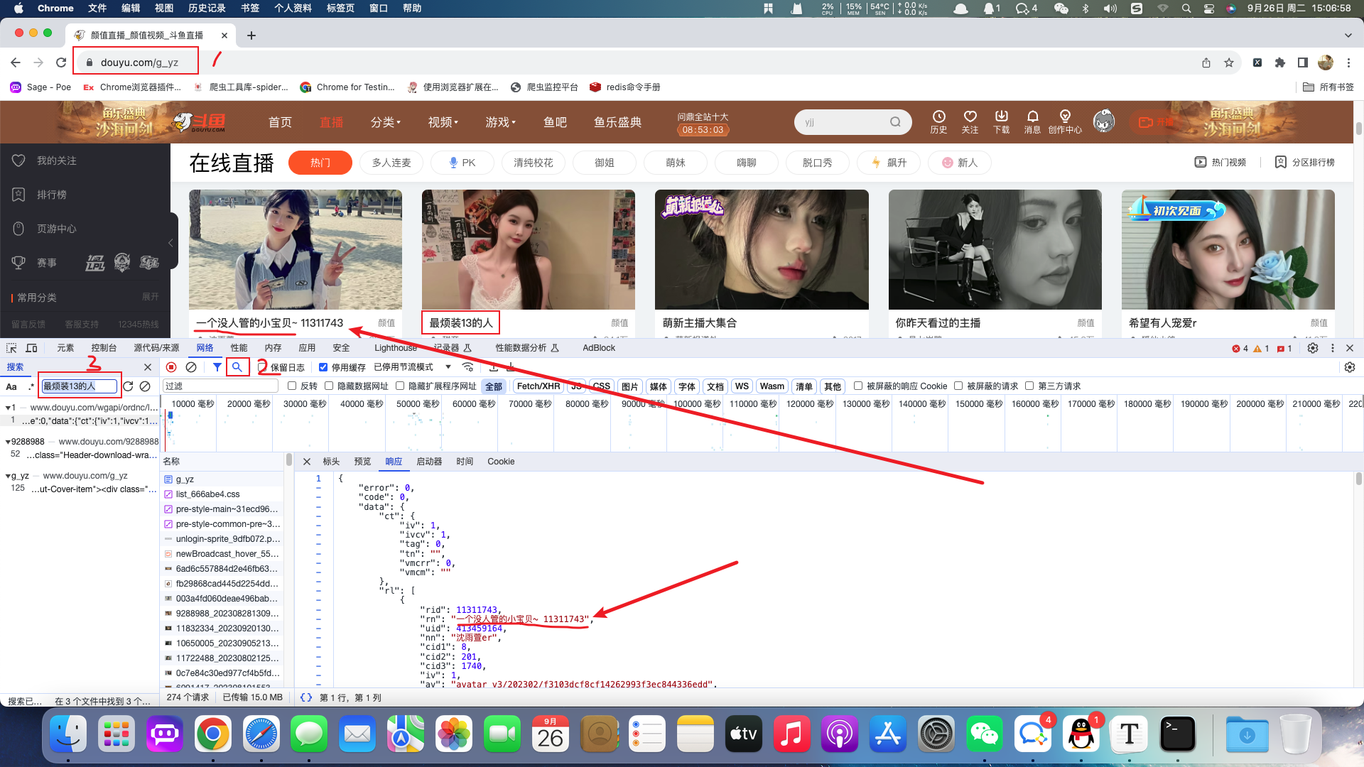 在一般的网站中,图片地址都是在html代码的img标签中的,例如百度图片。但是斗鱼网站进过分析之后我们发现,图片并不在html代码当中。像这种网站的资源都是动态加载过来的,所以需要善于利用浏览器开发者工具进行网络抓包。基于抓包我们发现当前图片等动态信息位于:https://www.douyu.com/wgapi/ordnc/live/web/room/yzList/1