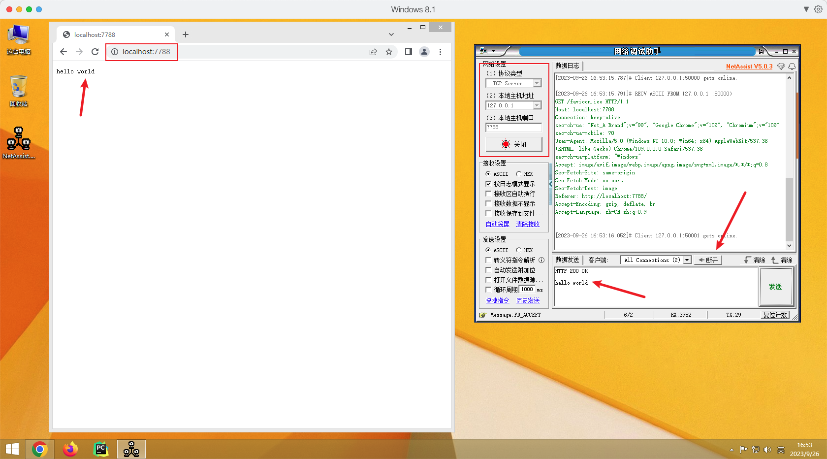 HTTP协议使用了TCP协议,接下来我们使用网络调试助手软件发送HTTP协议并携带hello world数据到浏览器。