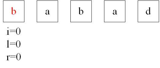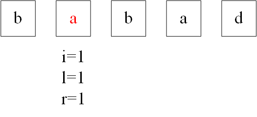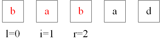 1. i=0开始遍历, 开始while循环, l和r都没有越界,并且两边字符相等, 此时两边收缩。