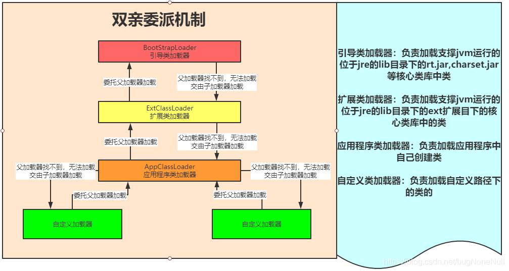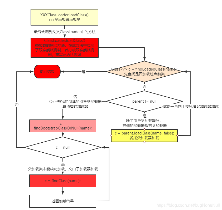 加载器会一直向上委托父加载器进行加载,最顶层的加载器加载失败,才会向下传递由子加载器加载,为双亲委派机制就体现在loadClass(String name, boolean resolve)方法中