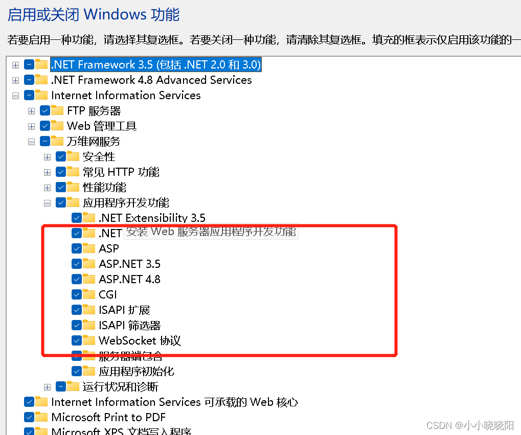 怀疑电脑没有成功安装对应的asp.net,打开"启动或关闭windows功能后"发现果然如此,我在配置iis的时候默认只选了父节点的复选框,没有打开确认子节点,全选后即可出现asp.net选项,网站也可以正常打开。
