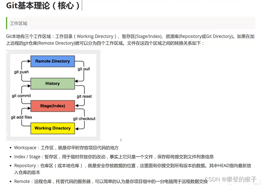 git工作流程,我们想把敲好的代码提交到远程的话,需要先将改动的文件添加到缓存区,然后将缓存区的代码提交到本地仓库,最后再推送到远程仓库。如果我们想获取某个项目,可以将其克隆下来,之后就可以对它进行修改和推送,还有拉取最新代码。