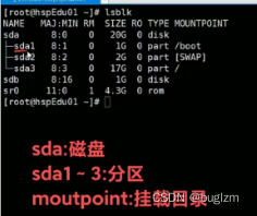 #查看所有相关磁盘和磁盘分区和相关分区挂在到了哪个目录 lsblk #分区命令,开始对/sdb分区 fdisk /dev/sdb # 执行命令后会有多个选项 # m 显示命令列表 # p 显示磁盘分区 同 fdisk -l # n 新增分区 # d 删除分区 # w 写入并退出 # 【说明】:开始分区后输入n,新增分区,然后选择p,【回车】【回车】分区类型为主分区。两次回车默 # 认剩余全部空间。 # 【最后】输入w写入分区并退出,若不保存退出输入q。