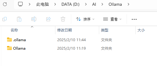4,上记说的两个文件夹移动到D盘,我的方法如下,也可 D:\Ollama ,因为考虑到 AI 方面的软件安装管理所有多增加了一个 AI 文件夹。