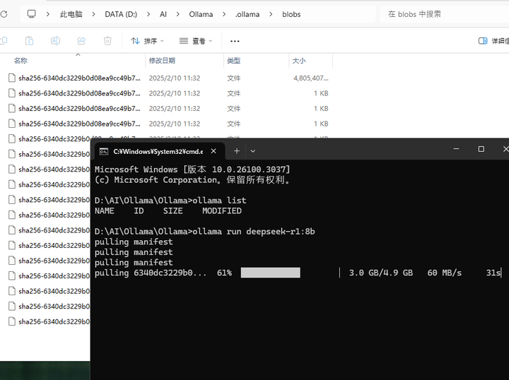 2,在 C:\Users\用户名\.ollama 这个路径下含有 models 和 blobs 两个文件夹,如果下载语言模型是默认下载这个路径下的 blobs 文件夹里。这个文件夹需要移动到D盘指定的文件夹。