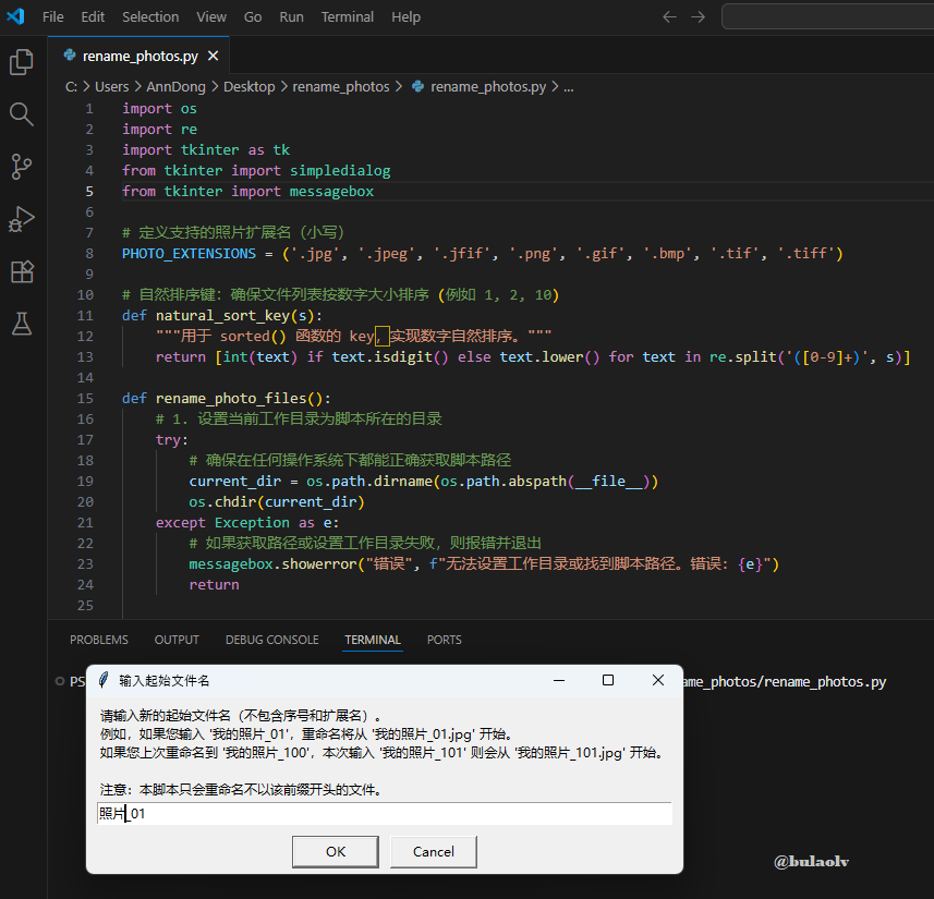 2,Visual Studio Code 终端中运行弹出提示框,如在框内输入 照片_01,然后点击OK,开始执行