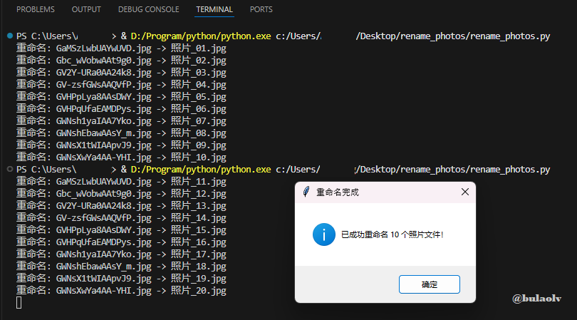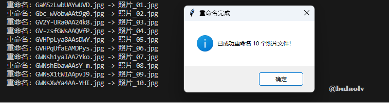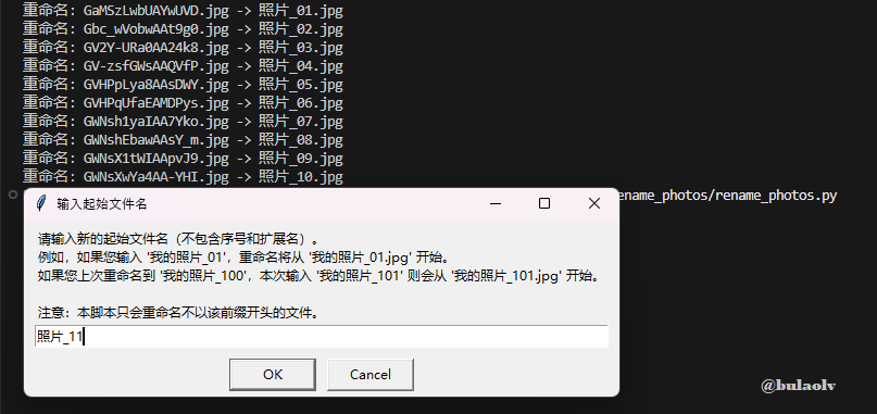 交互式命名: 脚本文件存放在照片文件夹内,双击运行后,会弹出提示框,可以自定义新的文件名起始编号和前缀(例如输入