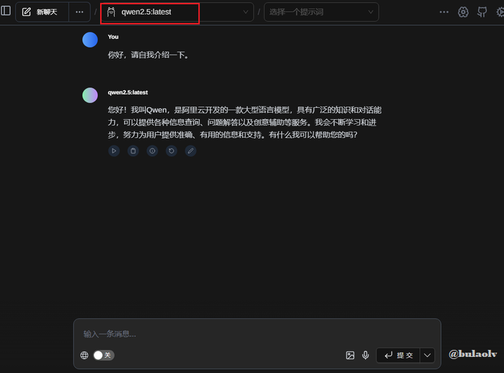9,在Ollama的UI界面选择Qwen2.5模型进行聊天测试