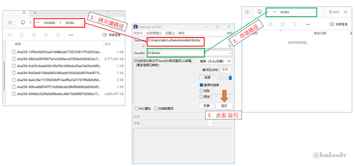 2,按照下图方式,把拷贝源路径复制到FastCopy的红框内,存放路径复制到绿框内,点击运行就OK
