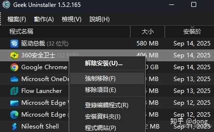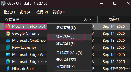 下图示例 删除火狐浏览器,可选择“解除安装(卸载)”或“强制移除(用于流氓软件)”,这里我用“强制移除”