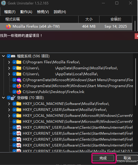 火狐浏览器删除后,会查找残留安装路径下的文件和注册表的信息,点击“完成”后都会不留痕迹的删除