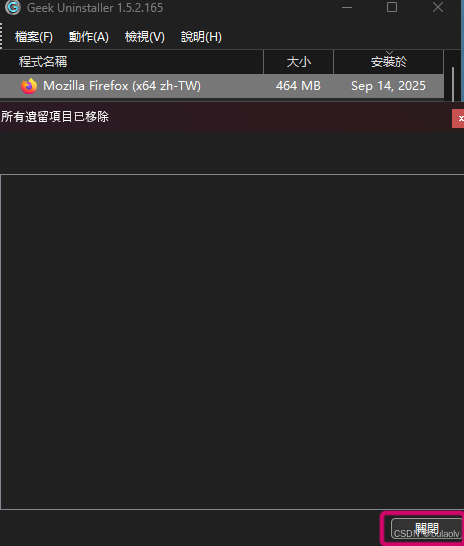 路径下相关文件夹及注册表都删除了,然后点击“关闭”,火狐浏览器就会从GeekUninstaller消失