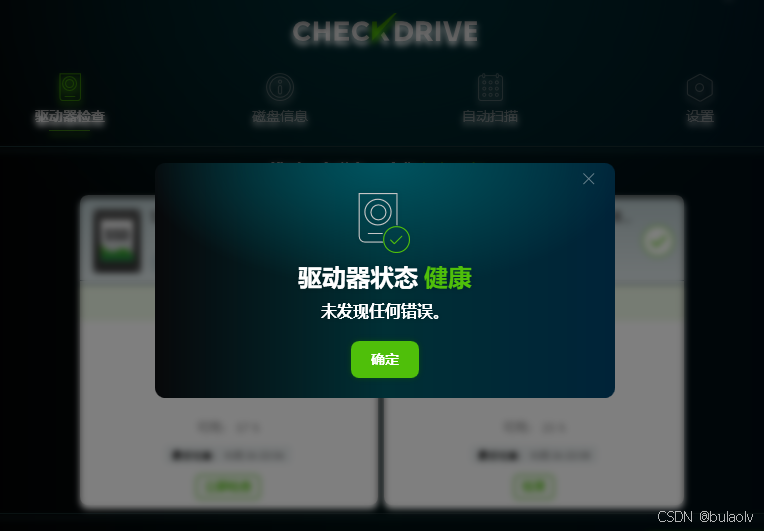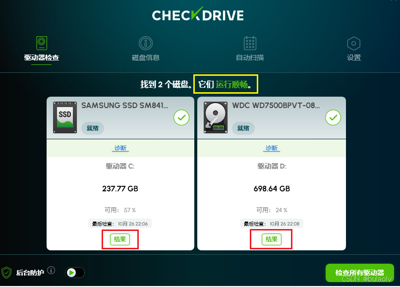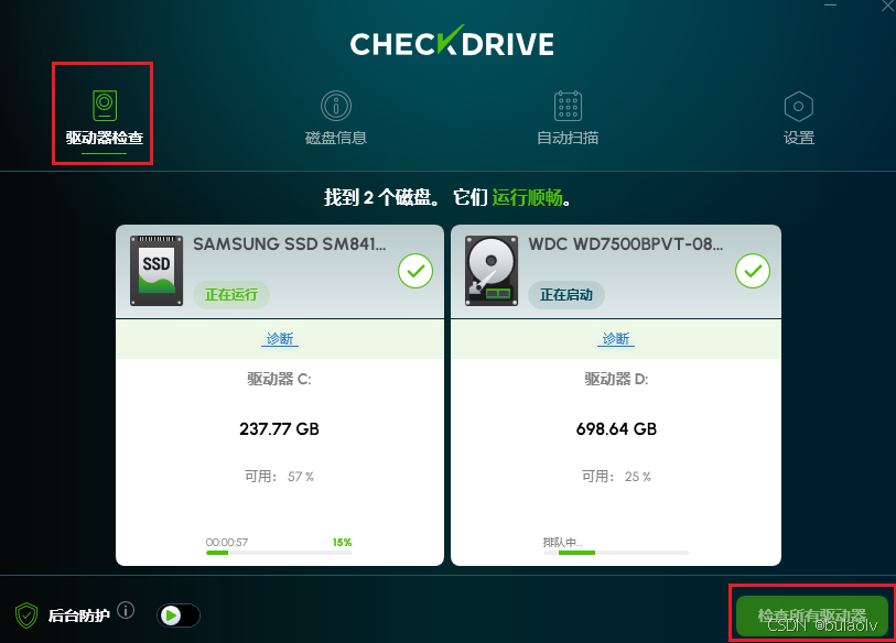 11,对于“驱动器检查”页面的2个磁盘,点击右下角的“检查所有驱动器”进行检查磁盘健康状态,磁盘下方会出现进度条