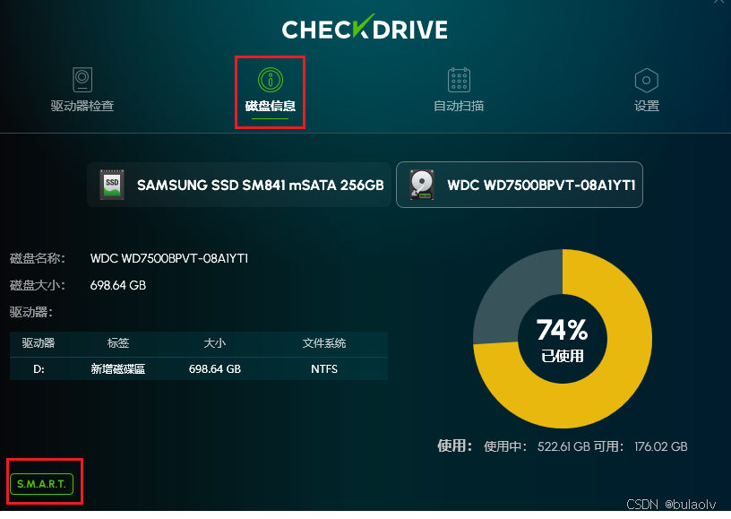 14,在“磁盘信息”界面里,点击 S.M.A.R.T.可查看磁盘详细信息