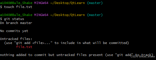 git status命令的作用就是查看文件状态。在带.git文件的目录下随便新建一个文件,如file.txt。此时再调用