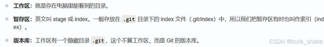 从第一章我们已经了解了一些Git大体概念,现在了解一些细节概念。在你创建的本地仓库中,其实存在三个概念--工作区(目录)、暂存区(.git里的index)和版本库(.git本身)。