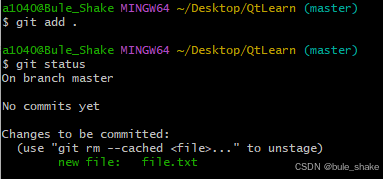 紧接着上面输入git add命令后再次使用git status命令可以发现,文件已经加入暂存区但是未被提交。