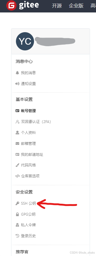 3)进入gitee的设置,找到ssh公钥。