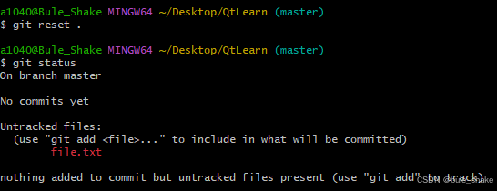 紧接上面输入git reset命令后再次使用git status命令可以发现,刚刚进入暂存区的文件已经退出暂存区了。(切换指定版本号则需要你有commit记录)