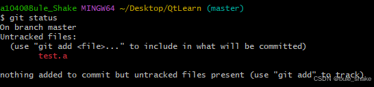 假设存在以下情景,你带.git的目录下有很多.txt和很多.a文件,这时你只想提交.txt文件。此时你使用git status查看文件状态发现git检测到.a文件未进入暂存区。设置黑名单如下: