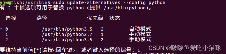 ls -l /usr/bin/python /usr/bin/python3 sudo update-alternatives --install /usr/bin/python python /usr/bin/python2.7 1 sudo update-alternatives --install /usr/bin/python python /usr/bin/python3.5 2 sudo update-alternatives --list python注意:这里第二第三行,python2.7和python3.5是根据前面ls -l /usr/bin/python /usr/bin/python3输出的python版本。如果输出是3.6,就要改成python3.6