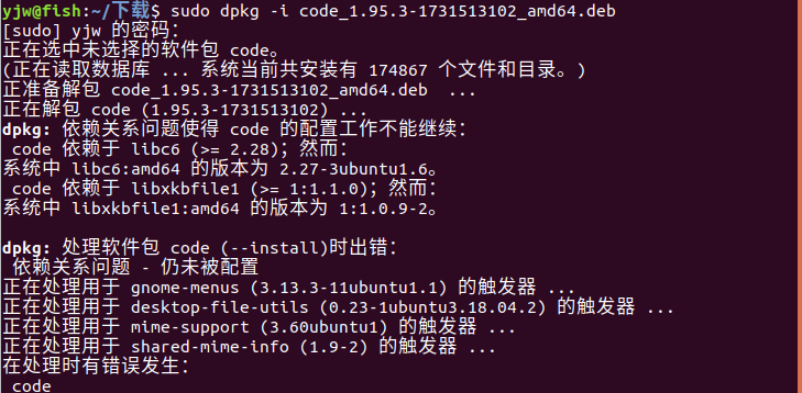 code 依赖于 libc6 (>= 2.28);然而:系统中 libc6:amd64 的版本为 2.27-3ubuntu1.6。