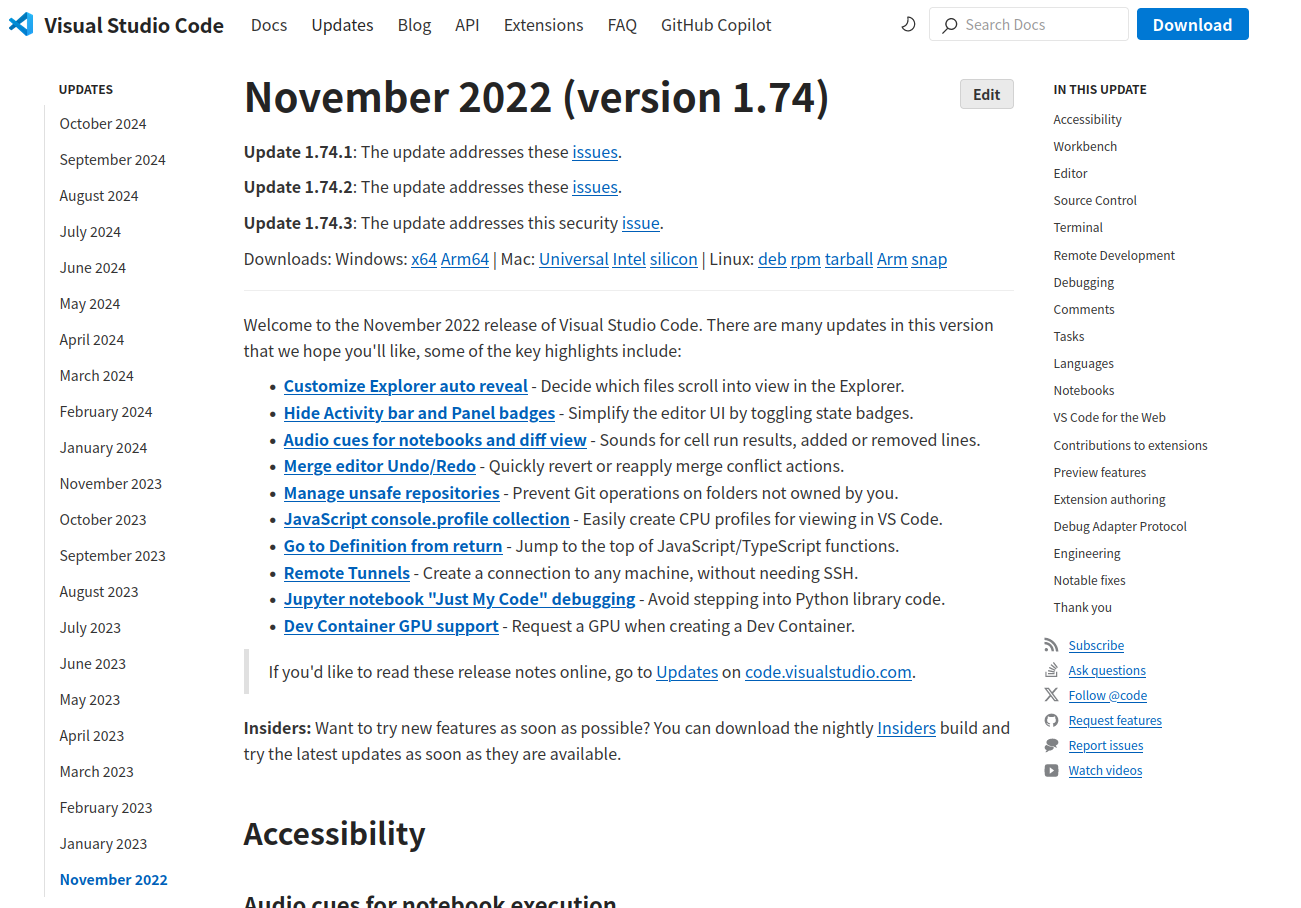 这是因为你安装的VScode版本太高,不适配,解决方法就是安装低版本的VScode。进入VScode官网,点击最Updates”,在最左侧一栏选择前几年的版本,比如我这里选择的是2022年的版本,然后在Downloads一行中选择“Linux:deb”,下在安装包即可