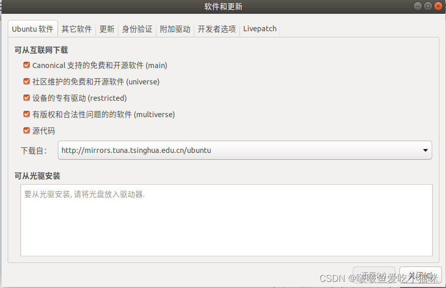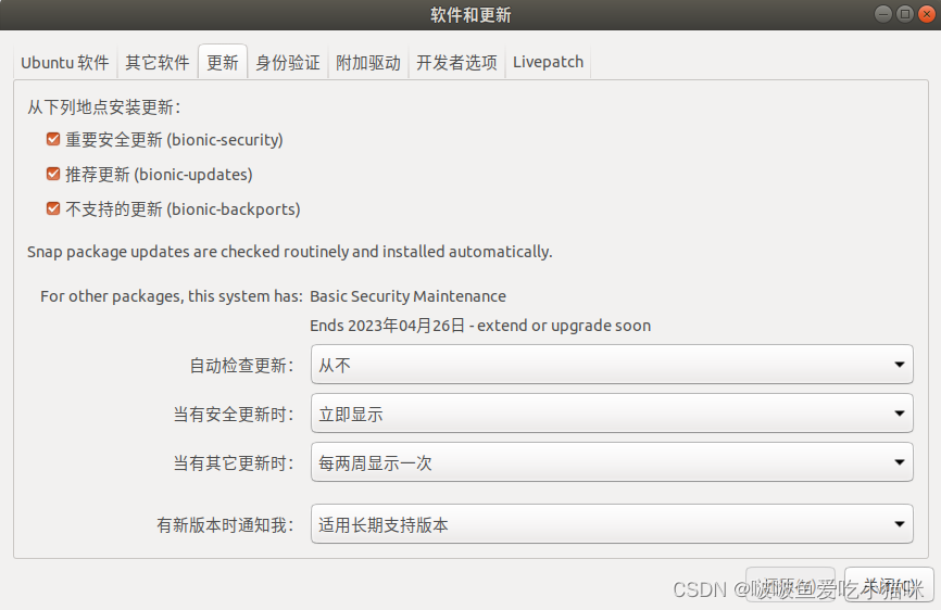 原因是在软件更新里没有勾选允许更新, 在软件和更新里面,勾选如下:
