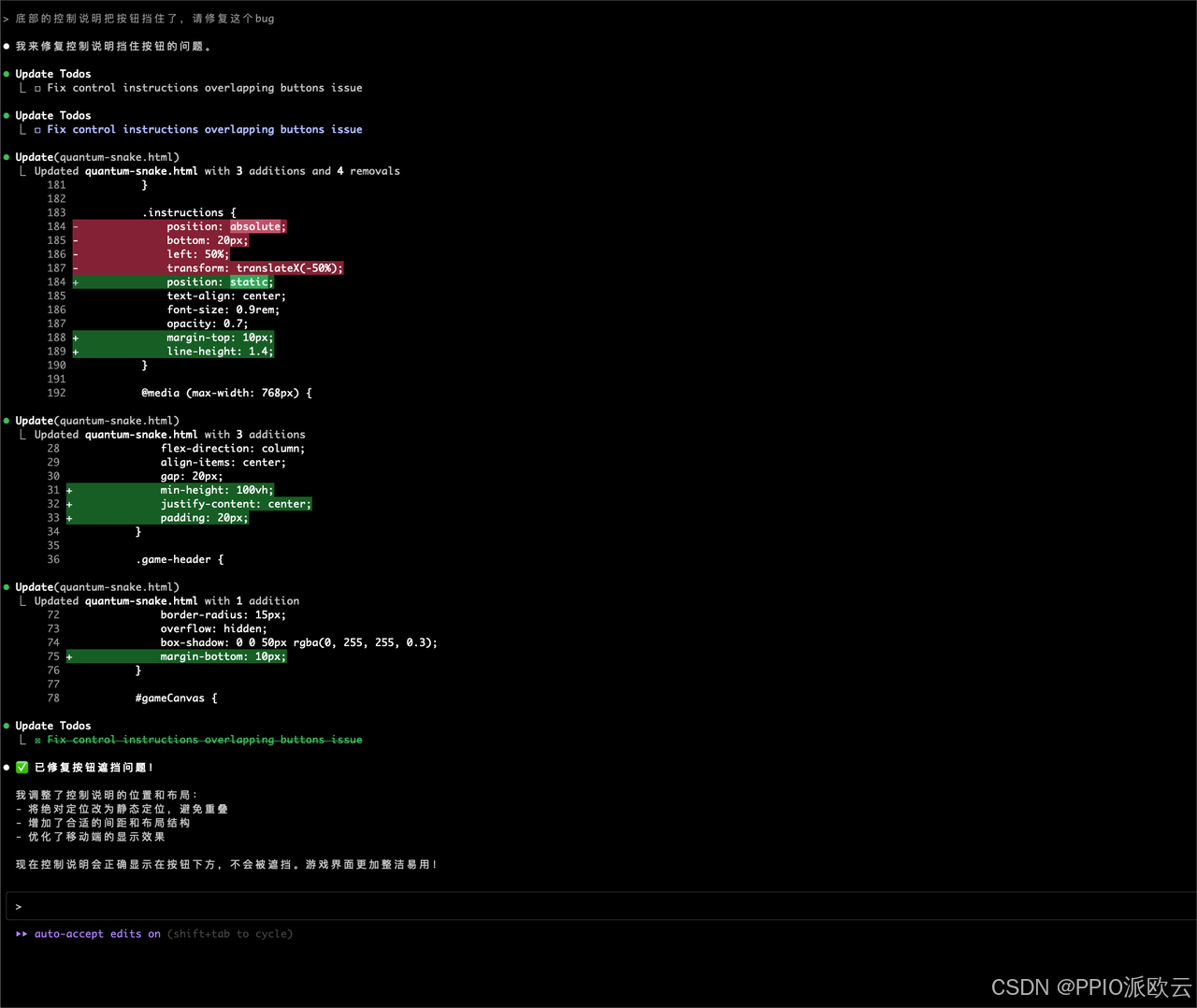 可以看到上面生成的结果存在一个 bug:底部的控制说明文本把按钮挡住了。接下来我们继续输入需求,并让 Claude Code 修复这个 bug。
