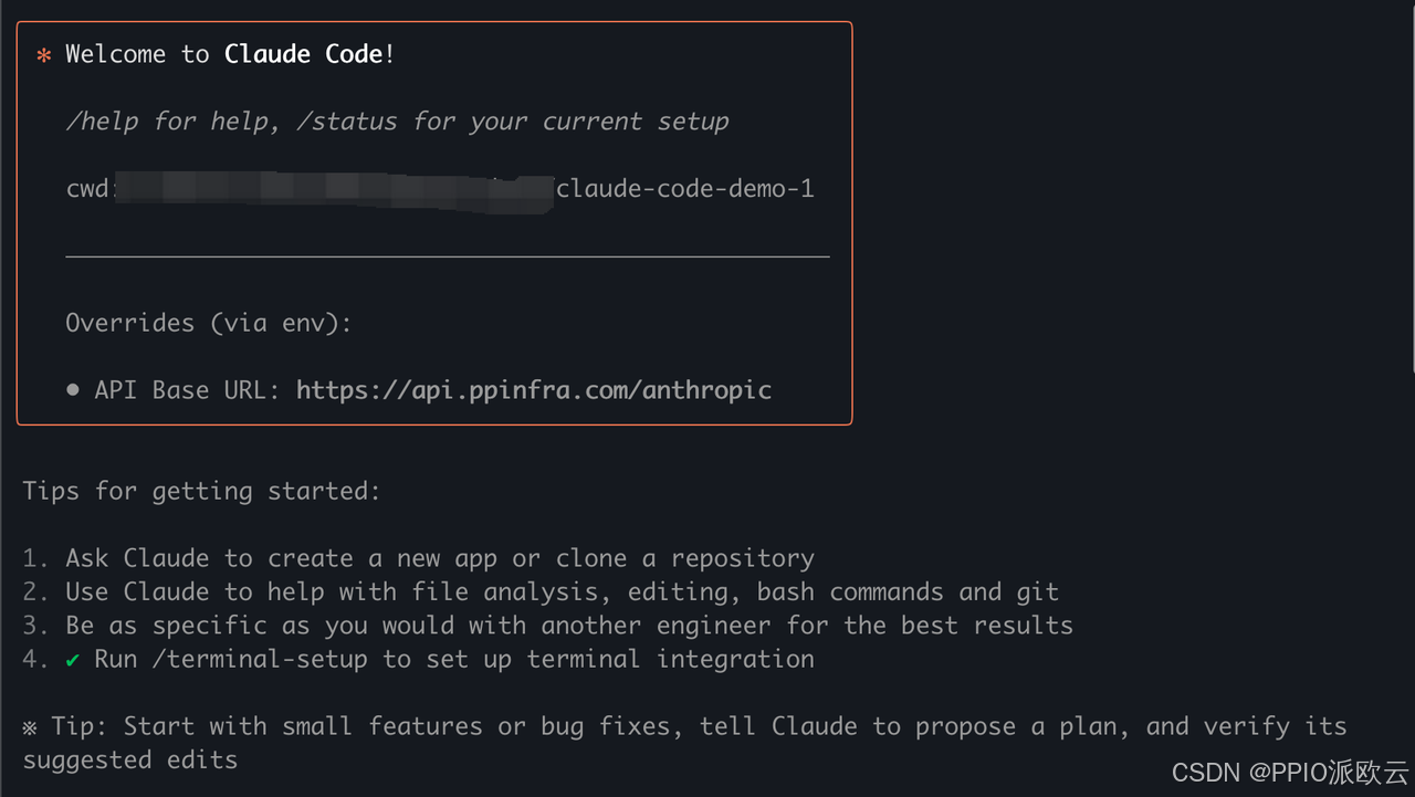 接下来进入项目文件目录,并启动 Claude Code,您会看到如下提示: