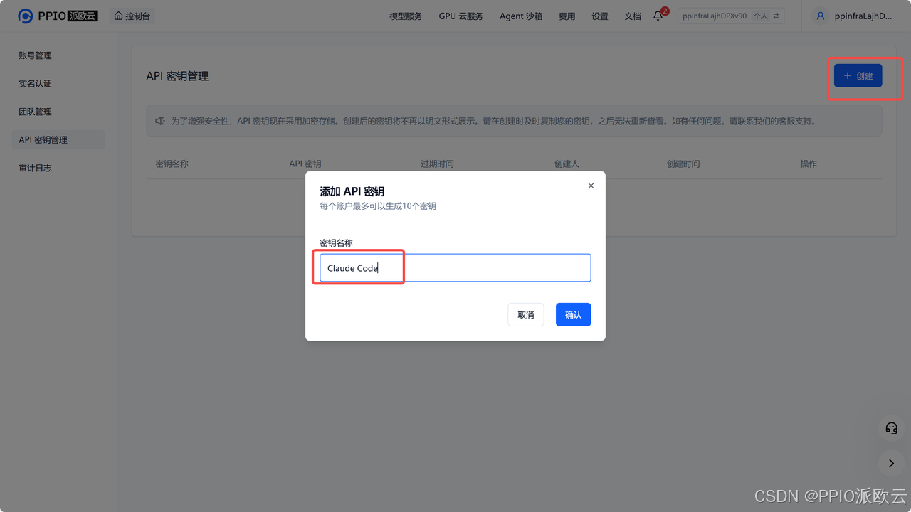 打开 API 密钥管理页面,点击创建按钮,输入自定义密钥名称,生成API密钥。