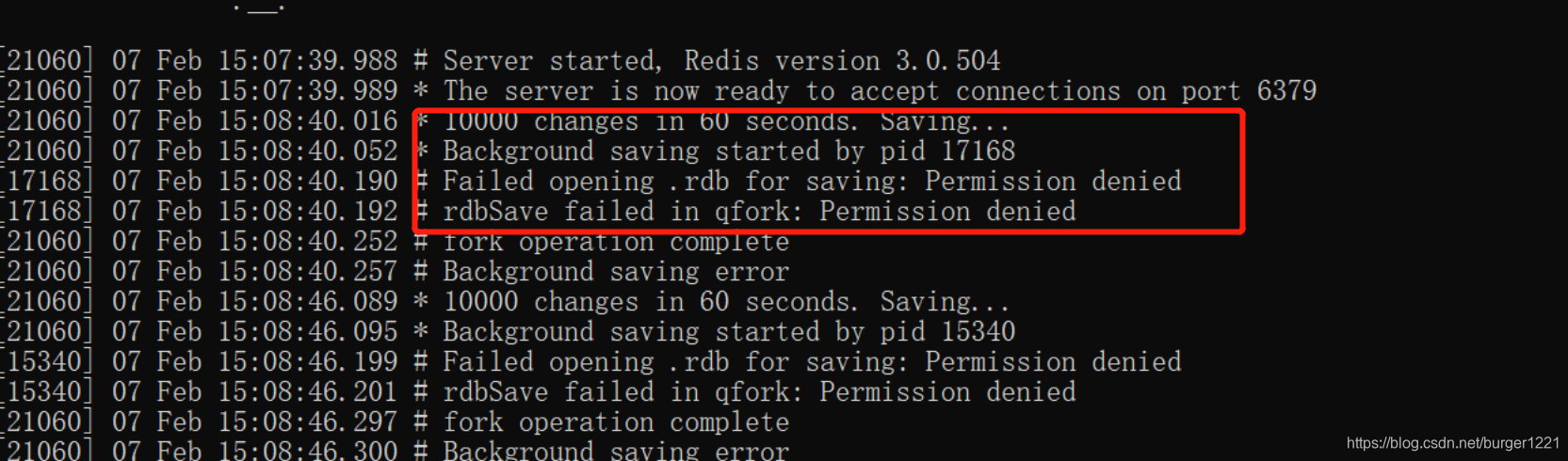 起因是Redis服务器在60秒之内,对数据库进行了至少10000次修改之后,服务器自动执行BGSAVE命令,这个命令触发后台进行备份,但是打开rdb文件的时候被禁止了。