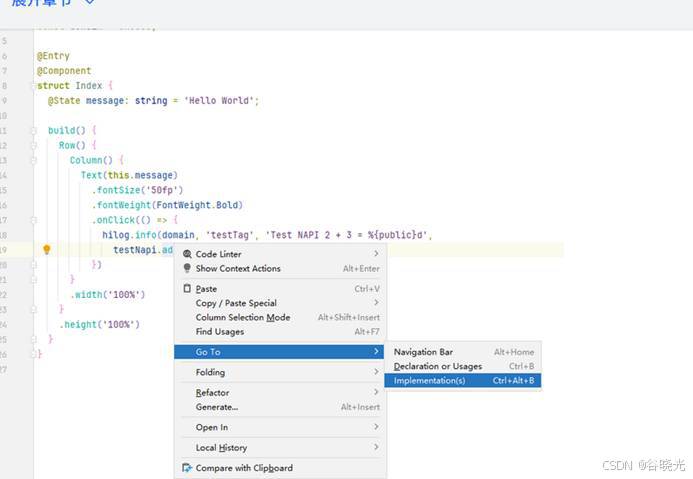 对于涉及跨语言开发,特别是声明调用了Native接口的项目,DevEco Studio的跨语言跳转功能十分实用。在代码中选中相关调用,然后选择`Go To > Implementation(C++)`,就能迅速跳转到对应的C++实现代码处。这一功能极大地提高了联合开发时不同语言代码之间的切换和查阅效率,减少了在不同文件和语言之间切换的繁琐操作。