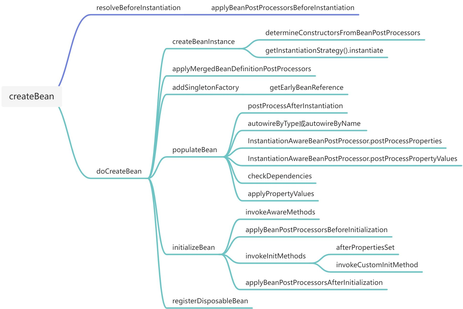 Bean实例化:遍历 beanDefinitionMap 创建bean,最终会使用getBean中的doGetBean方法调用 createBean来创建Bean对象
