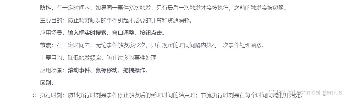 实现细节: javascript function throttle(fn, delay = 300) { let lastCall = 0; return function(...args) { const now = Date.now(); if (now - lastCall >= delay) { fn.apply(this, args); lastCall = now; } }; }