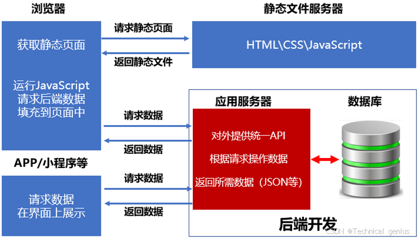 前后端分离是现在流行的一种开发模式,即前端负责渲染HTML页面,后端负责返回前端所需的数据,而不再控制前端的效果,用户看到什么样的效果,从后端请求的数据如何加载到前端中,都由前端自己决定。在前后端分离开发模式下,前端与后端的耦合度相对较低,在这种模式中,通常将后端开发的每个视图都称为一个接口,或者API,前端通过访问接口/API来对后端数据进行增删改查等操作。