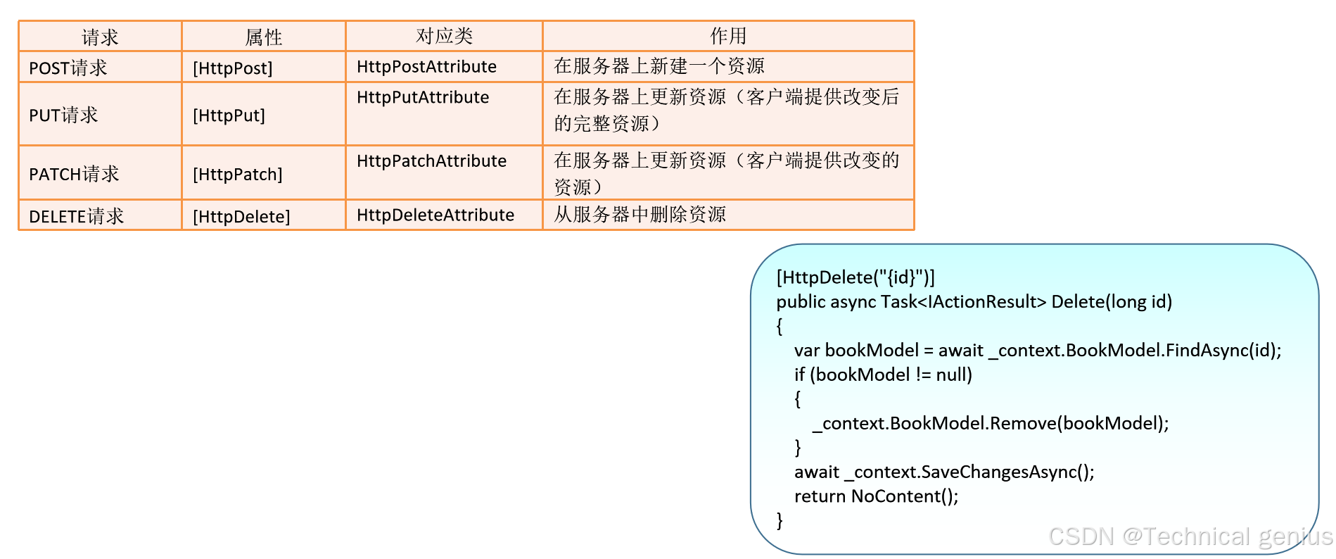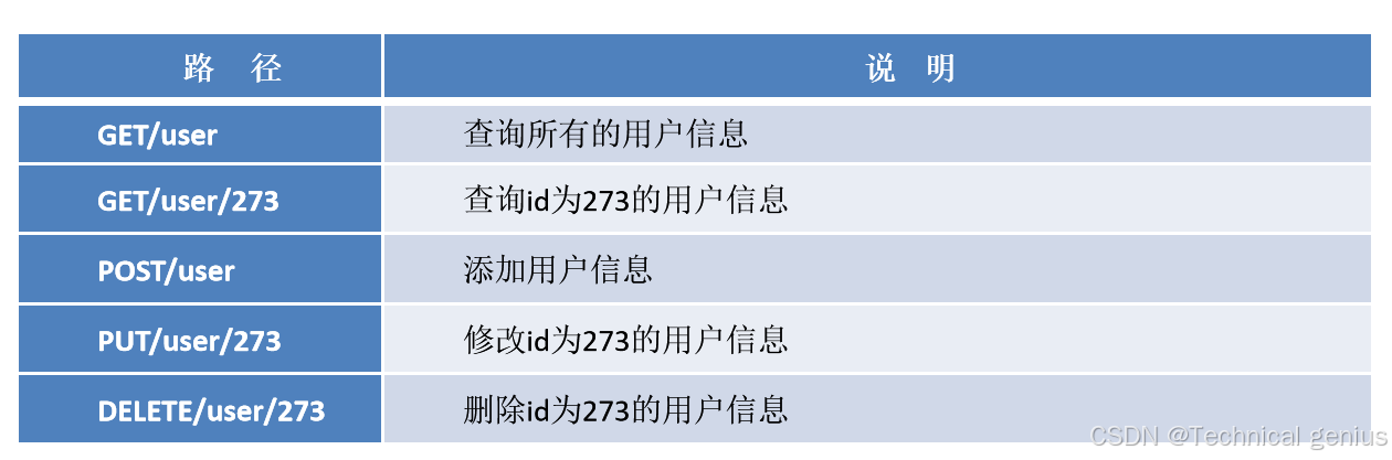 - 通过请求方式决定对资源进行什么操作(获取数据:GET请求;新增数据:POST请求;删除数据:DELETE请求;修改数据:PUT、PATCH请求);